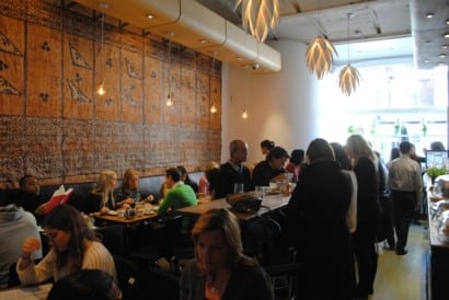 People are squeezed on sitdown tables around the edges, and along two long benches in the middle. It is a place where your proximity to your neighbour is such you can’t help but notice they’re also Australian, and therefore bond over your mutual appreciation of brunch and the 2-4-1 cocktails at the nearby Marylebone.