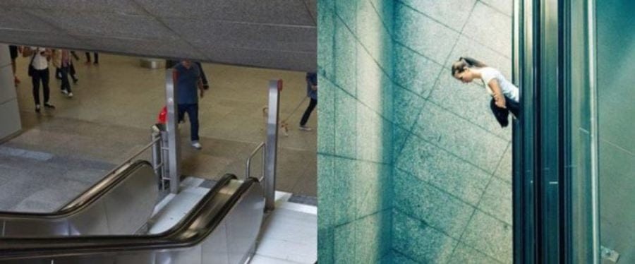 He took the next photo from the side to focus on the lines. “As you can see, you have the handrails on the side, the ones on the escalator, the ones on the wall and the lights on the top left.”