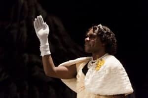 This is not such a problem for three quarters of the show where Namatjira’s life is celebrated. We see him as a typical teenager, falling in love, working as a stockman, meeting Rex Battarbee who teaches him to paint, becoming famous, making money and meeting the Queen. However, during the darker times — two of his children die, he loses his money, he is refused to own land, and is arrested and imprisoned — there is a disconnect, and the impact of these tragic circumstances is lost slightly, because Jamieson is still the storyteller performing as Namatjira, not just Namatjira.