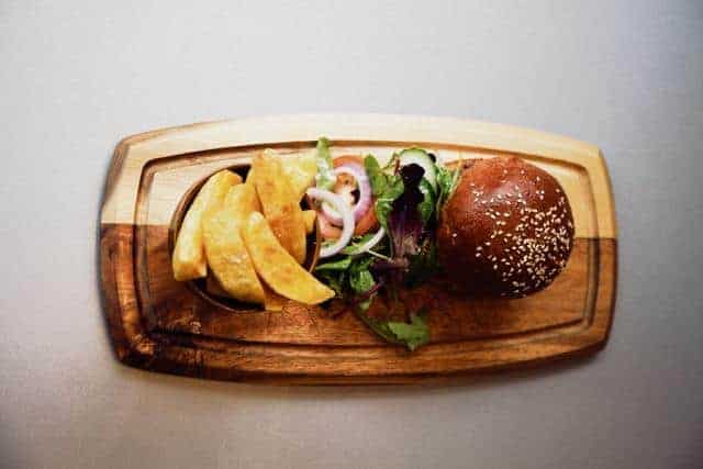 I must admit, I had pre-judged SLABS as primarily a burger restaurant, and wasn’t expecting to be impressed by the non-meat offerings. The two seafood starters certainly challenge my preconceptions, and are enough in themselves to satisfy any dining companions who are not fellow burger enthusiasts. The salt & pepper chilli squid is a substantial pile of lightly fried squid pieces. The sweet chilli dressing is tangy, fresh and full of flavour — fleshed out with coils of cucumber, sliced chilli and spring onion. The pan-fried tiger prawns are well-presented — thick, fleshy prawns sliced down the middle and served with a garlic and brandy jus sauce.
