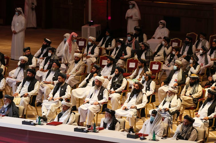 Members of the Taliban delegation attend the opening session of the peace talks with the Afghan government, Doha, Qatar, Sept. 12, 2020. Karim Jaafar/AFP via Getty Images