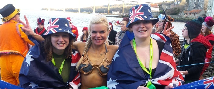 Dressed in catchy costumes and ‘down under’ attire, wading into the chilly waters of the scenic Edinburgh bay, daring backpackers donned Aussie flags and akubra hats (with inevitable corks) to accompany more localised swimmers in costumes as varied as the Loch Ness Monster and a one-man yellow submarine, complete with kilt.