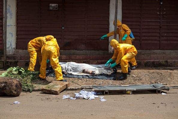 IMAGE: Volunteers pick up bodies of people who died of the Ebola virus in Freetown, Sierra Leone, Africa. (FLORIAN PLAUCHEUR/AFP/Getty Images)