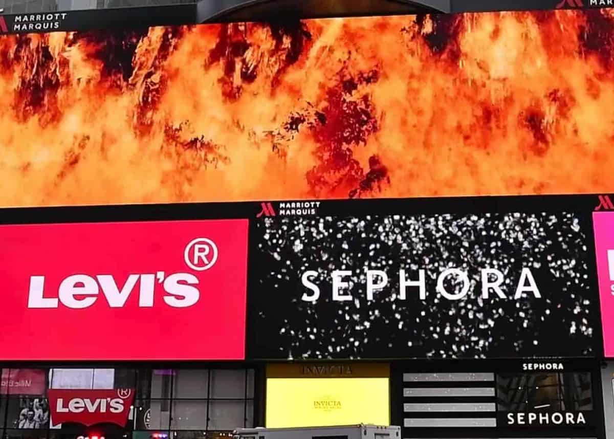The animated advert opens with: “Imagine fighting a bush fire higher than this billboard.” Darkened trees are then engulfed by huge flames, giving way to the message: “Thank you to the brave Australian and US firefighters defending Australia. And to the world for all your support.”