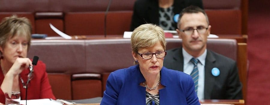 IMAGE: Library image of Senator Christine Milne in Parliament. New leader Richard Di Natale is seated behind her, to the right. (Photo by Stefan Postles/Getty Images)