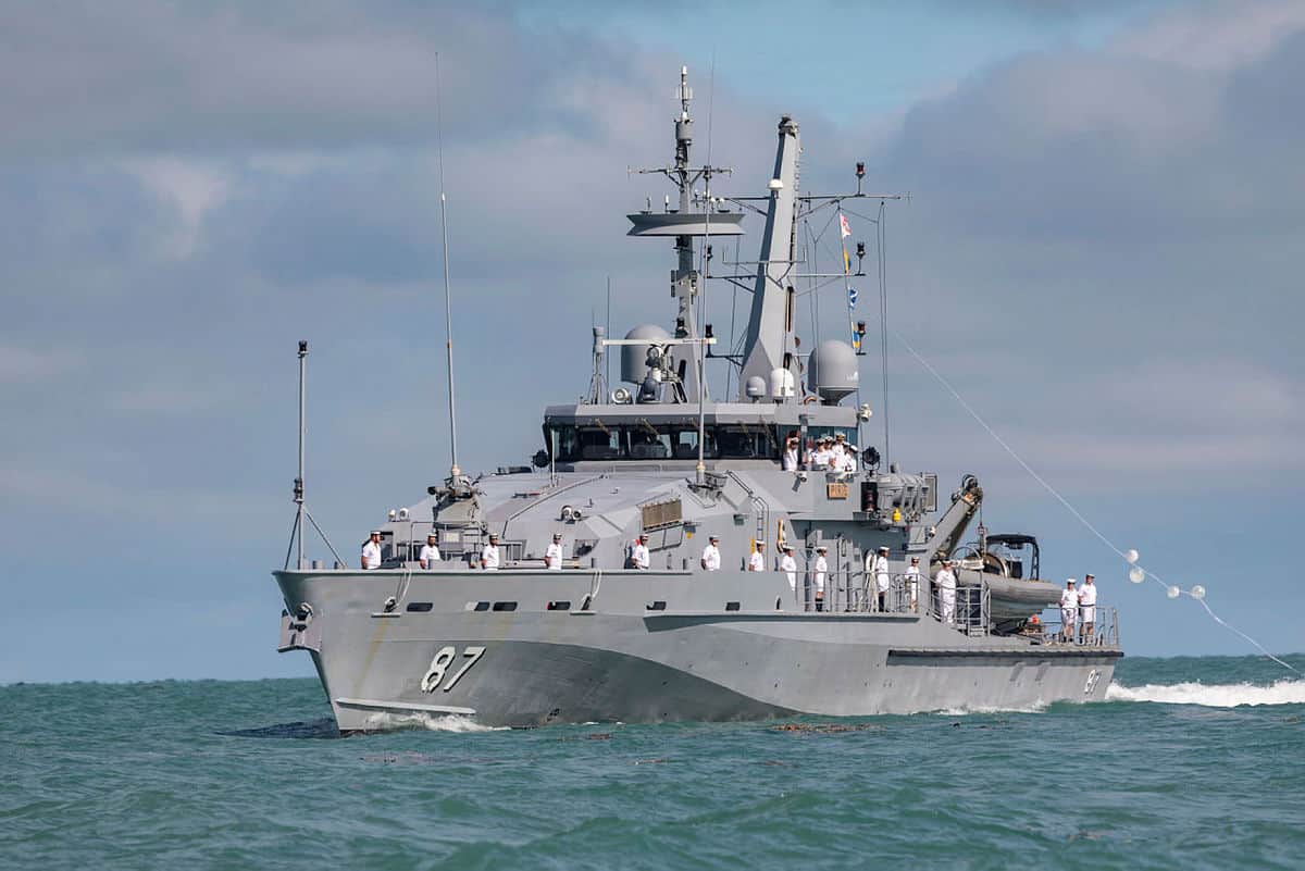 The lead vessel in the new class, HMAS Arafura is planned to enter service next year. The boats have a crew of 40, a length of 80 metres and a range of 4,000 nautical miles.