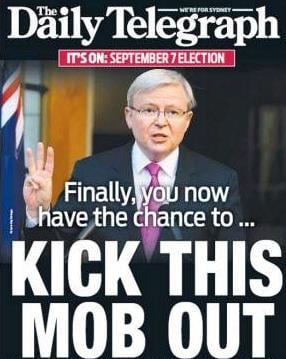 On day one of the federal election campaign, Sydney News Corp publication The Daily Telegraph led its Monday edition with a full-page photo of Mr Rudd and an editorial under the headline: “Kick this mob out”.