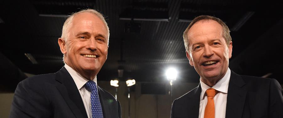TOP IMAGE: Leader of the Opposition Bill Shorten and Prime Minister Malcolm Turnbull shake hands during the 2016 Australian Federal Election election campaign. (By Mick Tsikas – Pool/Getty Images)