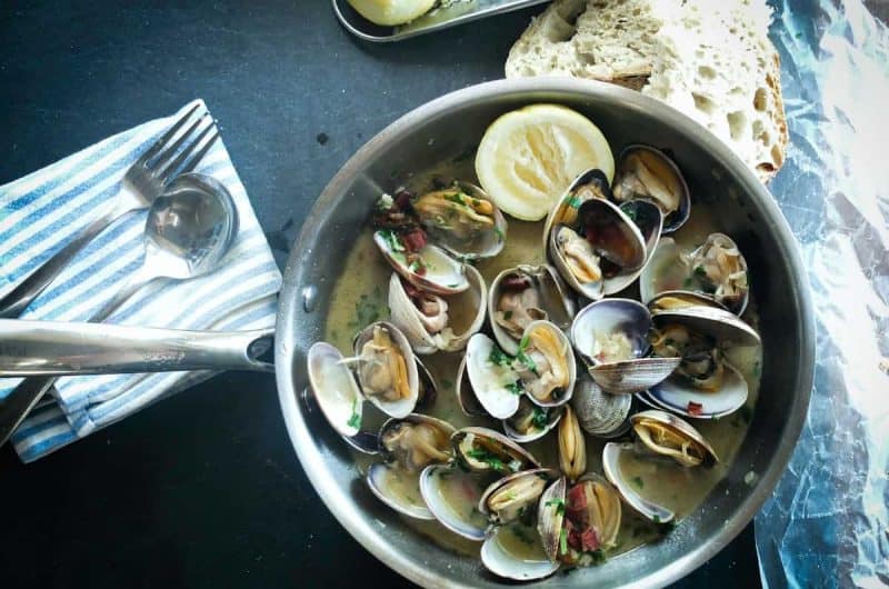The best thing about clams is that they require very little preparation. Just make sure they’re live when you buy them — check the shells are unbroken and stay shut tight when tapped. Give them a rinse under cold water to remove any sand or seagrass and they’re good to go!