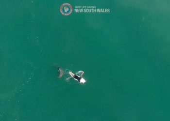 An aerial drone operated by Surf Life Saving NSW broadcasts warning as predator bears down on oblivious surfer.