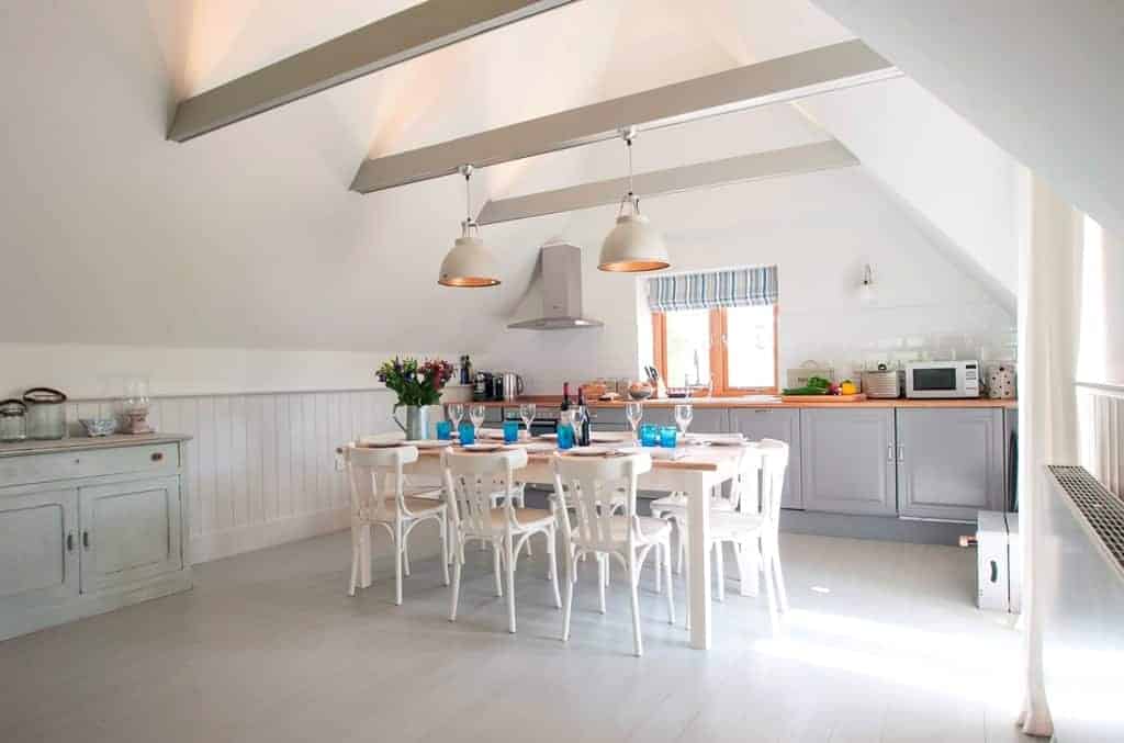 Quirkily, the chic nautical-inspired bedrooms (one double en-suite, one twin and one bunk bed) and modern bathrooms are downstairs, allowing the spacious open-plan kitchen and living room to occupy the whole of the first floor, all beneath an impressive timber-beamed vaulted ceiling.